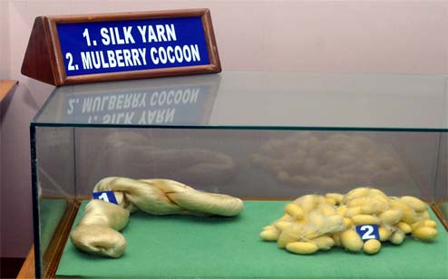 |  | SILK YARN & MULBERRY COCOON: Silk is a natural protein fiber which is obtained from the cocoons of the silkworm. It is a natural filament produced by the salivary glands of silkworms, which are a type of moth that feeds on the mulberry bush. They spin their cocoons using a complex set of mechanisms within their bodies when they change from larva into pupa. The origin of the silk dates back to 2600 B.C and the country producing the best quality of silk is China which is also known to be the birth place for the silk fibre. It is protein in nature and so exhibits the natural characteristics which resemble the wool fiber. The cultivation and manufacturing process of silk fiber is a costly affair, making silk a costly fiber. The different varieties of silk produced in India from different species of silkworm are mulberry silk, muga silk, eri silk and tussar silk.